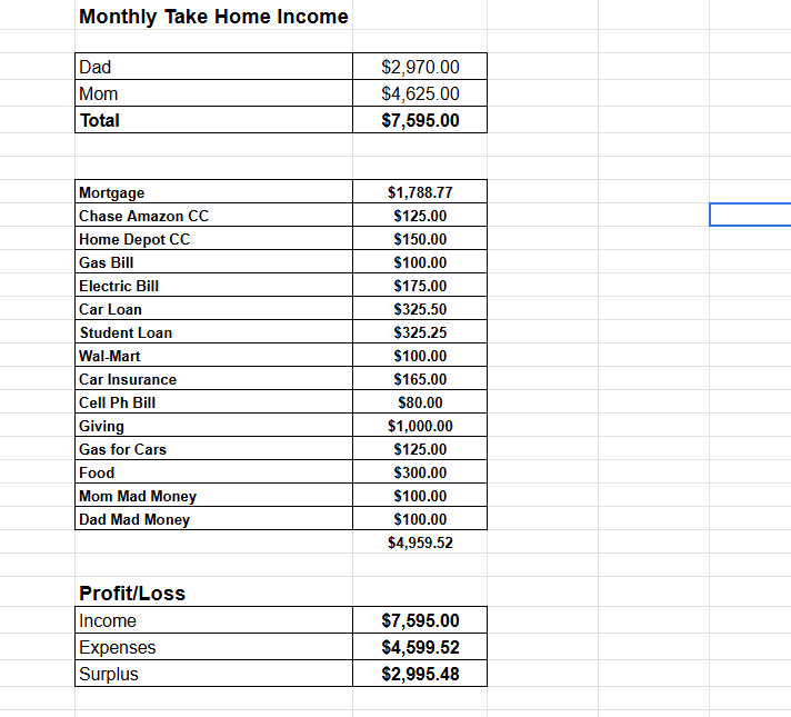 Screenshot of personal budgeting spreadsheet in Google Docs