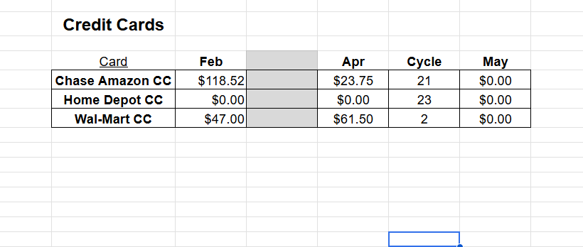 Credit Cards — Each card listed with cycles (current/next/next-next month). Gives 5–6 weeks float interest-free if managed tightly.